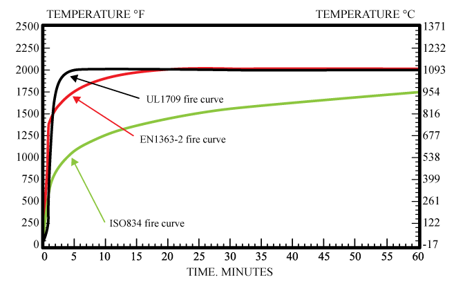 A number of standards have been developed for fire resistance tests. In each of the test standards, one of the key test parameters defined is the controlled time-temperature curve (fire curve) of the furnace. Figure 6 compares three of the most commonly used fire curves defined in ISO 834, EN 1363-2 and UL 1709 standards respectively.
