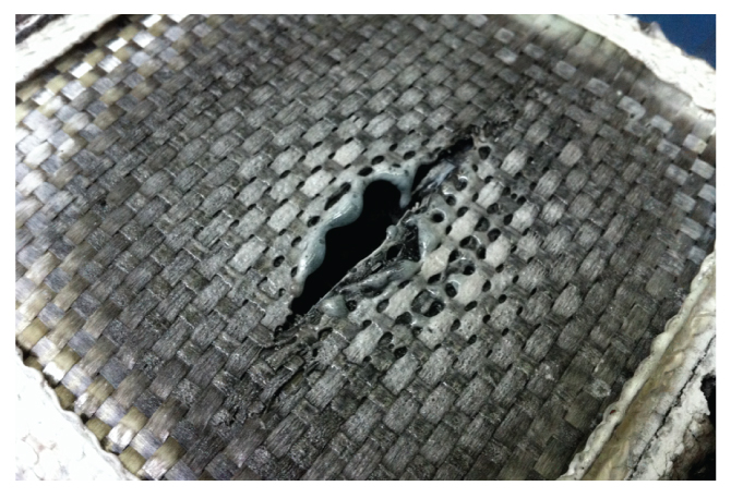 When exposed to the high temperature fire studied in the present work, the vinyl ester resin burnt quickly leaving behind the bare fibre cloth. As shown in Figure 13a, within approximately the first five minutes of a fire test, the resin combusted to produce a strong yellow flame and a significant amount of smoke.