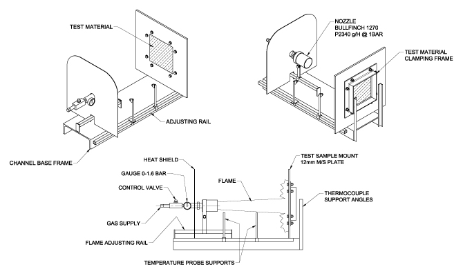 Regina developed a test rig for comparing burn behavior of different formulations, based on work done by Prof. Geoff Gibson, Professor of Composite Materials Engineering at the University of Newcastle upon Tyne.