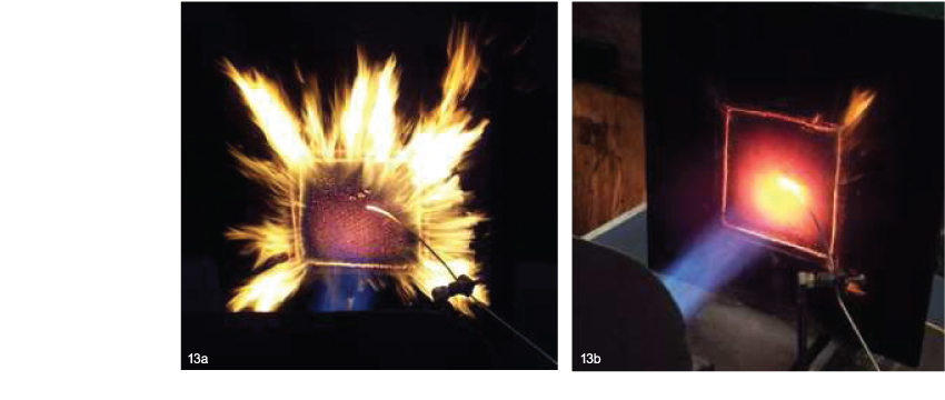 Depending on the thickness of the front face laminate, this burning period could last up to about fifteen minutes, after which the resin was consumed and the flame disappeared, see Figure 13b.