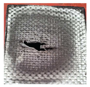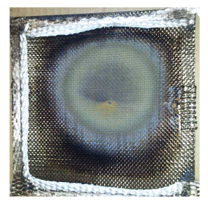 When exposed to the high temperature fire studied in the present work, the vinyl ester resin burnt quickly leaving behind the bare fibre cloth. As shown in Figure 13a, within approximately the first five minutes of a fire test, the resin combusted to produce a strong yellow flame and a significant amount of smoke.