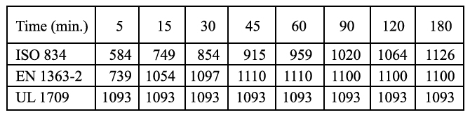 A number of standards have been developed for fire resistance tests. In each of the test standards, one of the key test parameters defined is the controlled time-temperature curve (fire curve) of the furnace. Figure 6 compares three of the most commonly used fire curves defined in ISO 834, EN 1363-2 and UL 1709 standards respectively.